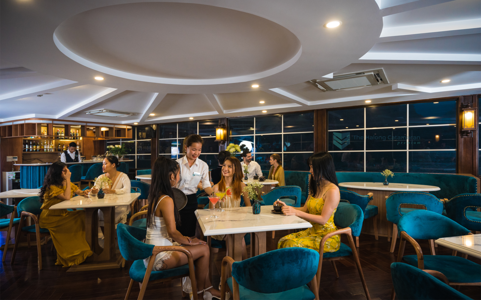 Đầu bếp sẽ phục vụ quý khách với những món ăn ngon miệng, kết hợp với các loại cocktail đẹp mắt, rượu vang hảo hạng và bia. Quầy bar sẽ mở cửa để pha chế các món đồ uống khác nhau.
