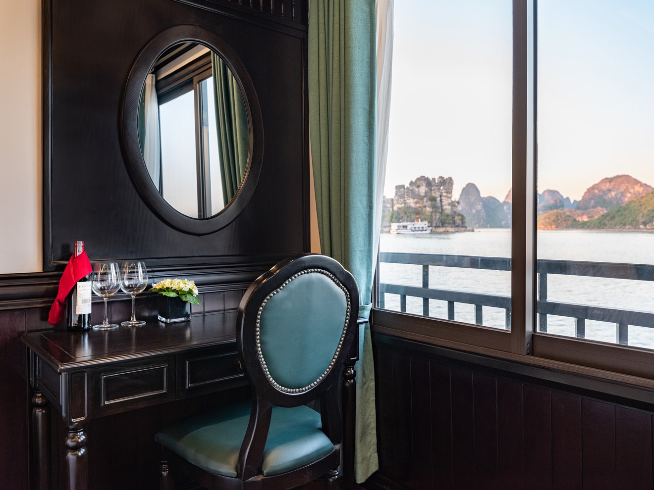 16:00 Quý khách trở lại tàu nghỉ ngơi trong lúc du thuyền nhẹ nhàng di chuyển đến khu vực Trà Báu. Đây là thời điểm tuyệt vời để ngắm nhìn phong cảnh ngoạn mục của Vịnh từ ban công riêng và săn những bức ảnh nắng chiều đẹp nhất của biển cả.
